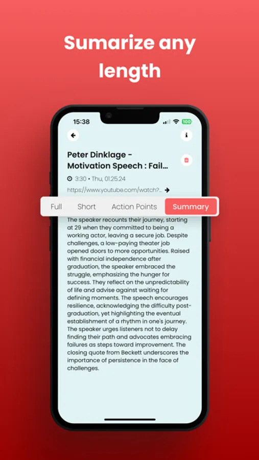 YouTube Integration: Effortlessly transcribe and summarize YouTube videos directly within the app. Perfect for educational content, interviews, or any video you want to transform into a concise text-based format.