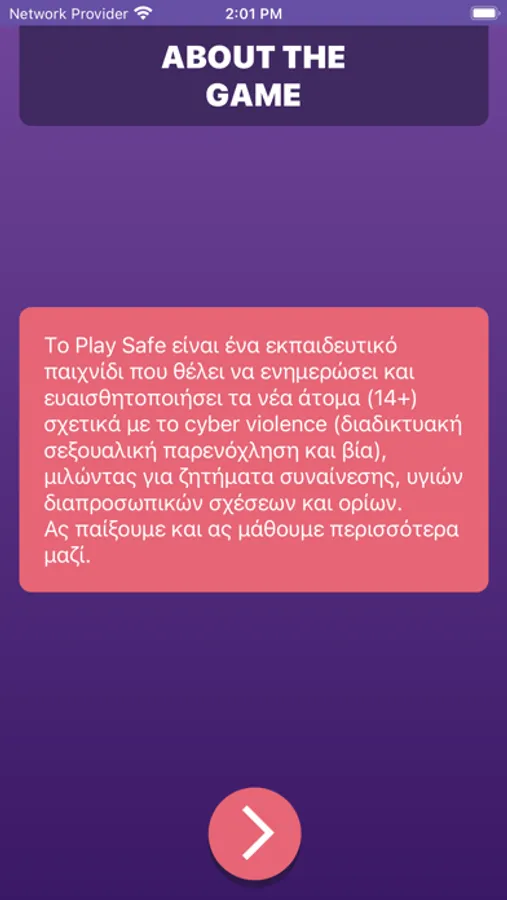Play Safe is an educational game that aims toeducate and raise awareness among young people (14+) about cyber harassment and cyber violence, by addressing topics such as consent, healthy interpersonal relationships, and personal boundaries. It is available in Greek, English, Farsi, Italian and French.