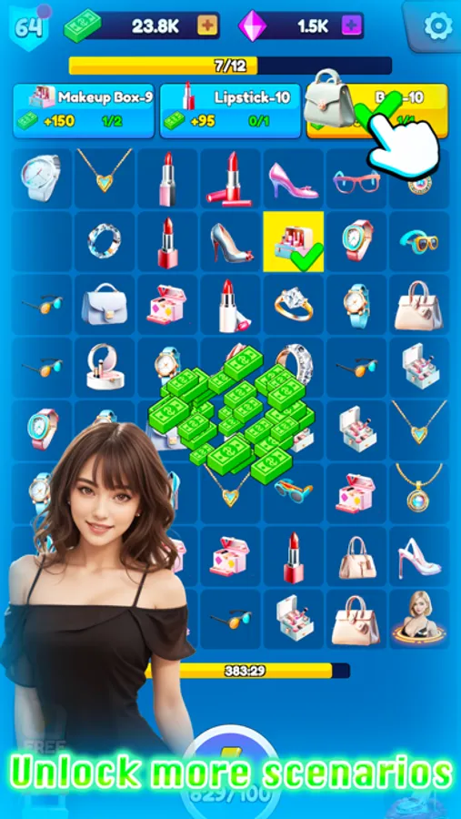 This game obtains more advanced items by continuously combining lipstick, perfume, high-heeled shoes and other items. These more advanced items can complete the task to get the capital to unlock more pretty girls.