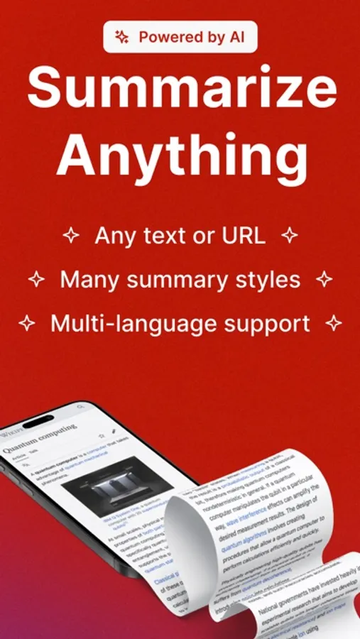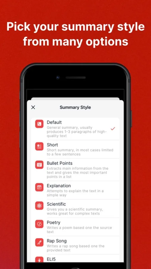And guess what? The app is not constrained by language. Choose from multiple languages to summarize your text. The app also lets you pick your summary style. Broken down bullet points? Check. Digestible dialogue? Yep, we got that too. Simple, straightforward paragraphs? Of course. Customize your summary the way you like it.