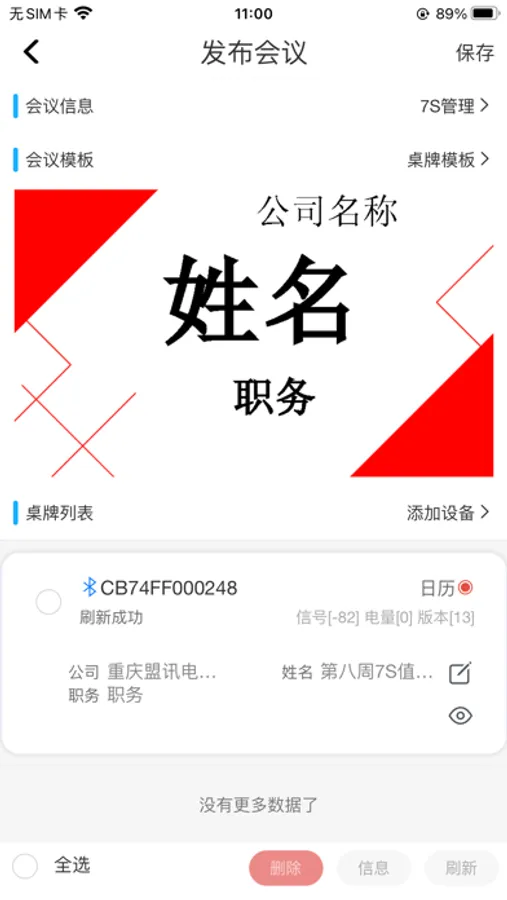 会议管理:主要功能是创建一次会议任务,会议名称,选择模板,选择设备,选择信息就可以通过Wifi和蓝牙等操作刷新电子桌牌