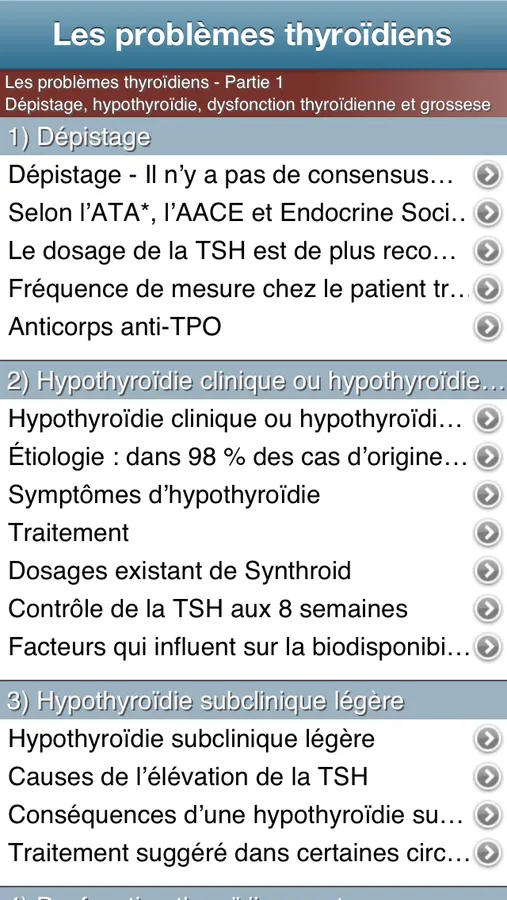 Suite à une revue de la littérature, les auteurs de cette application vous offrent les données les plus à jour sur l’évaluation, le traitement et la prise en charge des patients atteints des affections thyroïdiennes fréquentes. Vous aurez ainsi réponse à vos questionnements cliniques quotidiens tout en maîtrisant la bonne technique d’examen de la glande thyroïde.