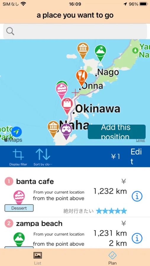 The list of places you want to visit can be displayed in order of distance from your current location, making it easy to plan your trip.