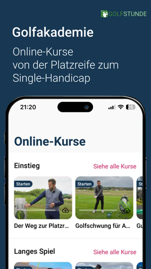 Werde ein besserer Golfer mit den Online-Kursen der GOLFSTUN.DE Akademie. Die verschiedenen Online-Kurse decken alle Bereiche des Golfspiels ab. Verfolge das jeweilige Kursziel und verbessere Dein Handicap. Die Trainingspläne in den Online-Kursen bringen Dich Schritt für Schritt voran und die Grundlagen werden erklärt. Du kannst das Gelernte in Übungen anwenden und anhand der Tests überprüfen, wo Du stehst. In der App gibt es kostenlose und kostenpflichtige Mitgliedschaften.