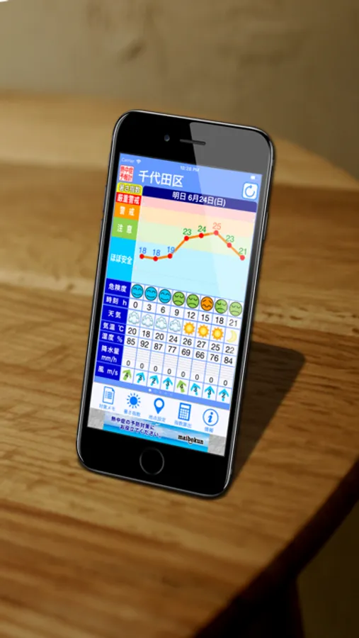 熱中症の危険度を5段階で表示。同時に5つの市区町村を登録できます。