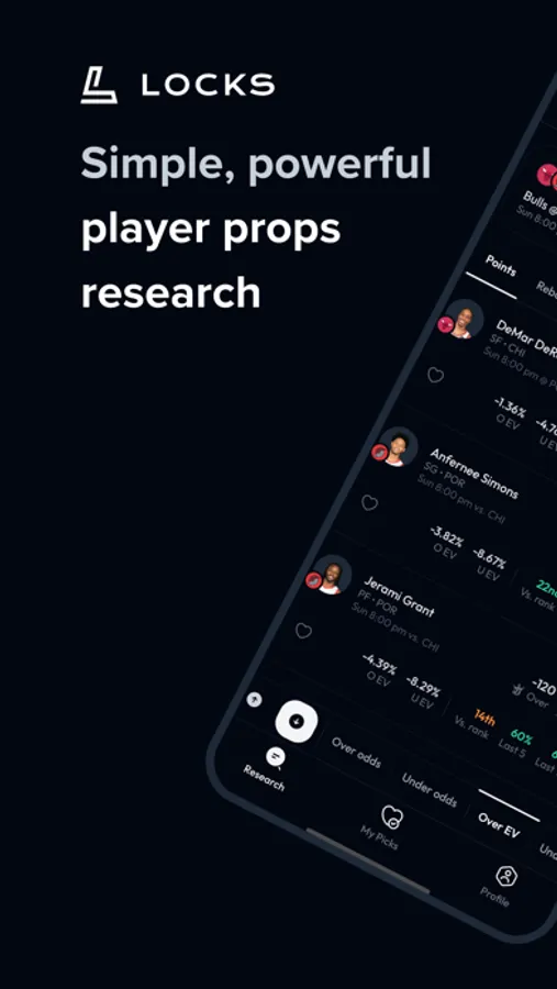 Locks is the go-to player props research tool for quick value identification in sports betting markets. It's user-friendly for both beginners and seasoned sports fans. Locks uses AI-powered proprietary algorithms to determine the expected value and true probability of a bet hitting, ensuring you are always knowing the value of your picks.