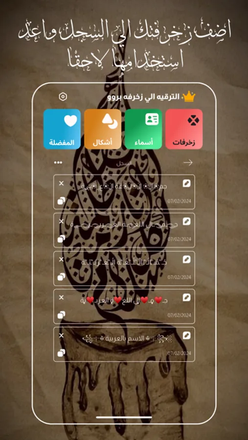 تجمع تلك المميزات في تطبيق "زخرفة " لتمنح المستخدمين تجربة إبداعية فريدة وتجعل عملية كتابة النصوص أكثر متعة وتعبيرًا عن شخصيتهم. استمتع بتحويل كلماتك إلى فن مرئي مع هذا التطبيق المبتكر.