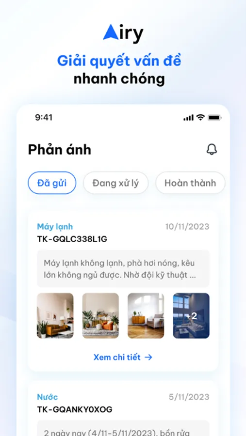 - Phát hiện vấn đề về căn hộ? Chỉ cần chụp ảnh và gửi báo cáo ngay lập tức qua Airy. Đội ngũ hỗ trợ chuyên nghiệp của AirCity sẽ nhanh chóng tiếp nhận và xử lý yêu cầu của bạn.