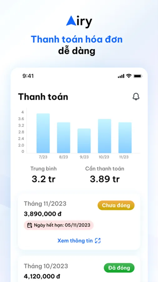 - Quản lý được chi tiêu: Airy sẽ cập nhật về lịch sử chi tiêu điện, nước hàng tháng. Giúp bạn có cái nhìn trực quan hơn về chi tiêu điện, nước hàng tháng dưới dạng biểu đồ.