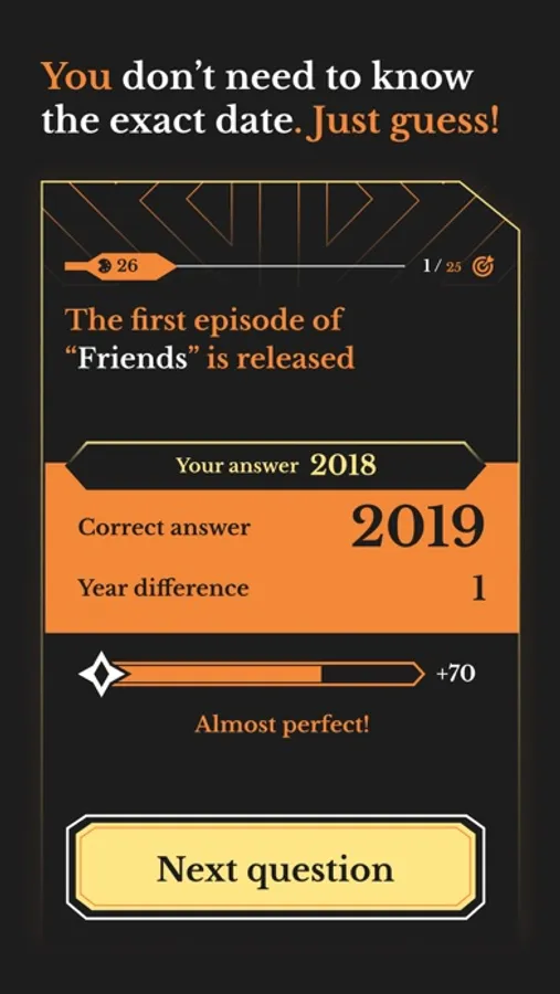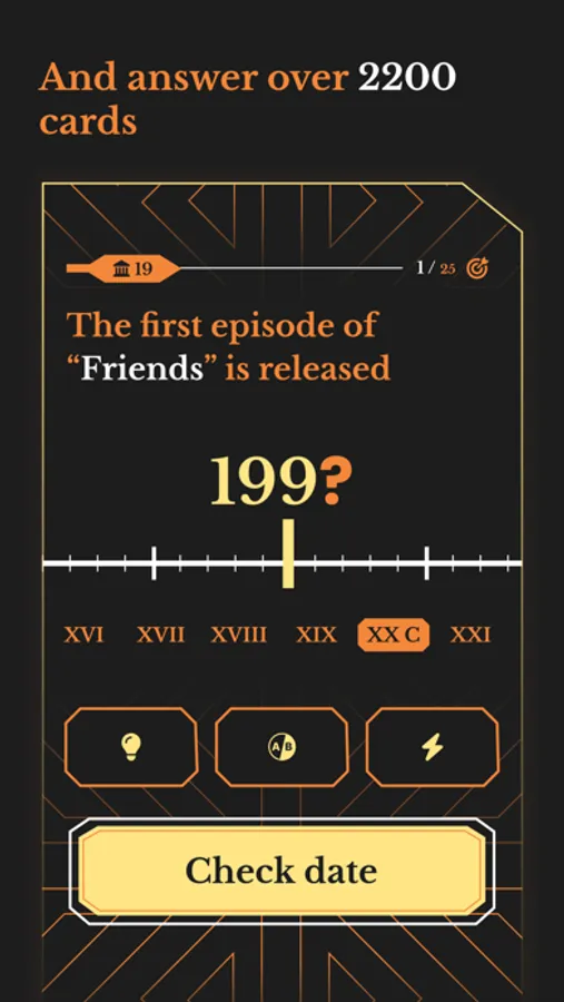 - Hints - if you get stuck while guessing the date, you can use hints to get closer to the correct date. You can choose between narrowing the timeline, revealing the last digit, or switch to quiz mode where you choose the correct date from multiple options.
