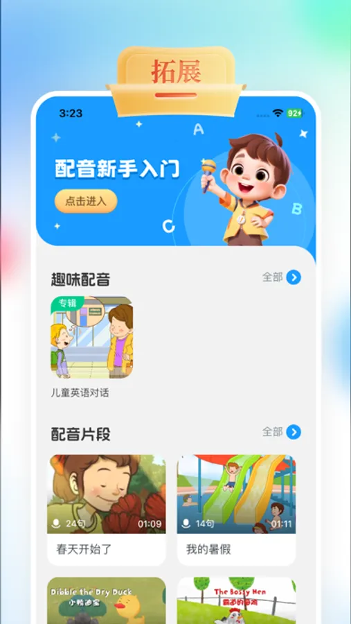 6.趣味配音:精选影视、动画、纪录片、演讲等趣味有益视频片段,适配单元话题,有效提高学生口语能力。