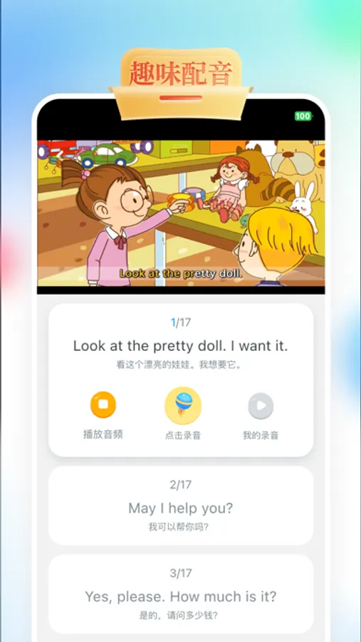 2.课文读背:同步教材课文,支持逐句跟读、通篇朗读、逐句背诵三种练习模式,巩固课文知识,提升口语能力。