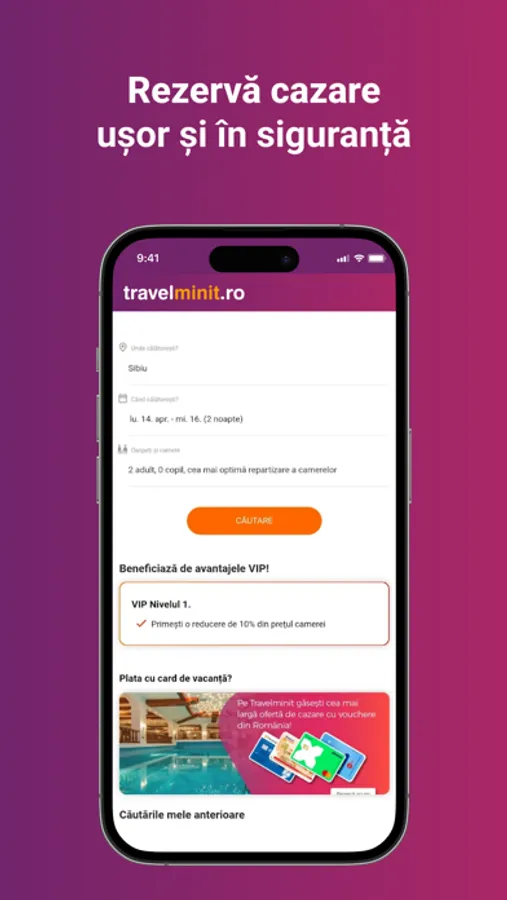 Cu aplicația Travelminit.ro poți găsi cazarea perfectă cu doar câteva atingeri. Folosește filtrele, consultă recenziile și economisește cu reducerile VIP.