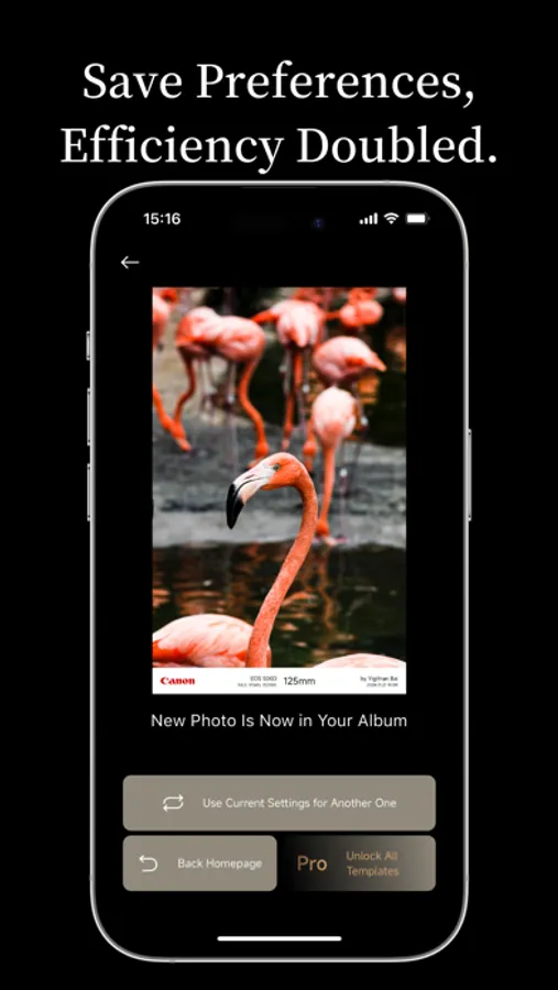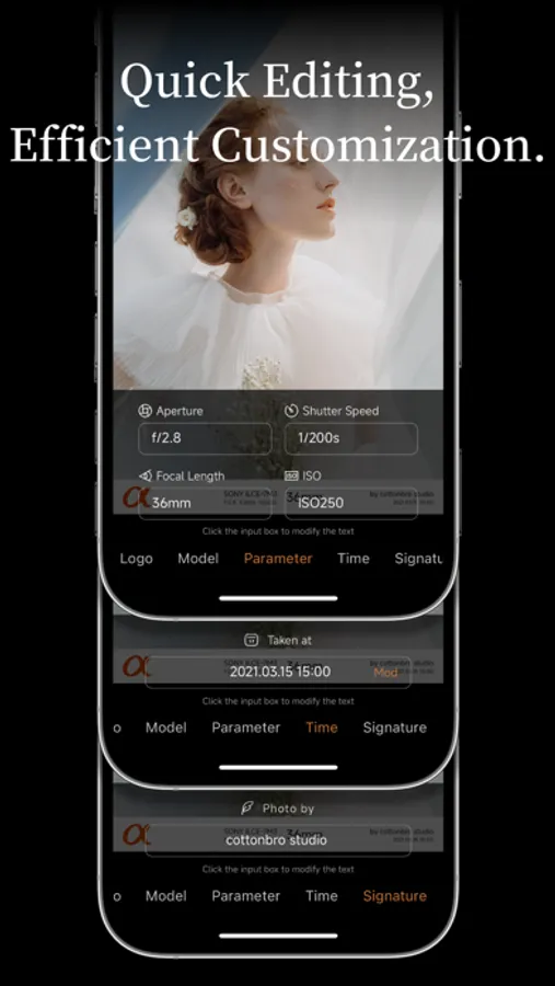 Supports a variety of image formats including JPEG, PGN, BMP, WEBP, DNG, NEF, RAF, CR3, etc. Transfer photos taken with digital cameras to your phone, and as long as they are readable in the iPhone Photos, we can accurately read them. Exif information incomplete? No problem, from logos to text, everything is customizable.