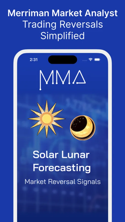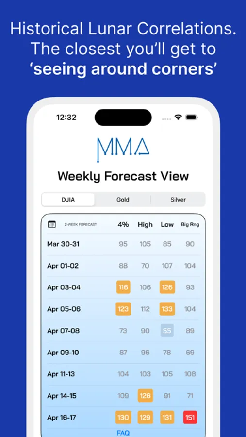 The MMA App is a market timing tool that provides weighted value (WV) scores based on Sun/Moon historical studies of reversals of at least 3%. The higher the WV, the greater the frequency that a reversal of at least 3% has occurred previously, and thus the higher the probability that a reversal will occur this time too if the setup is in force. Alerts are provided when the WV for a particular 1-3 day period is greater than 138.