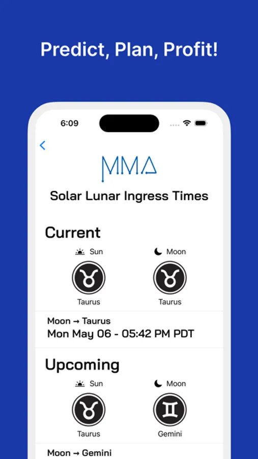 The dates given are based on the position of the Sun and Moon at noon that day. However, since futures markets trade nearly 24 hours, from Sunday evening through Friday evening Eastern time, traders should also apply weighted values (WV) to the day before and day after those shown in the app as well.