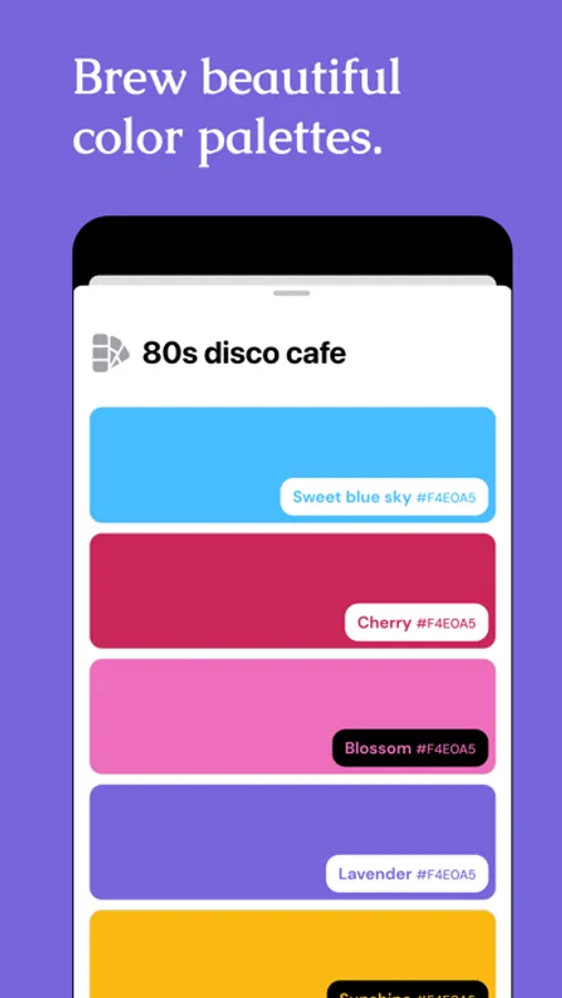 Explore new colors in each generated palette and discover unique names that create a whole new connection to each shade.