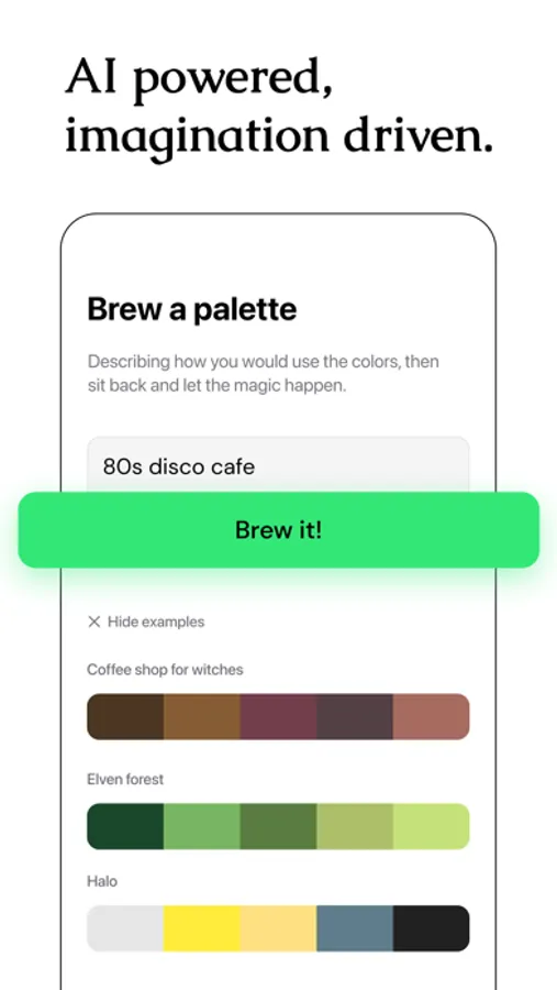 Creating new color palettes is as simple, yet powerful, as describing how you would use the colors. Color Cauldron AI will do the rest.
