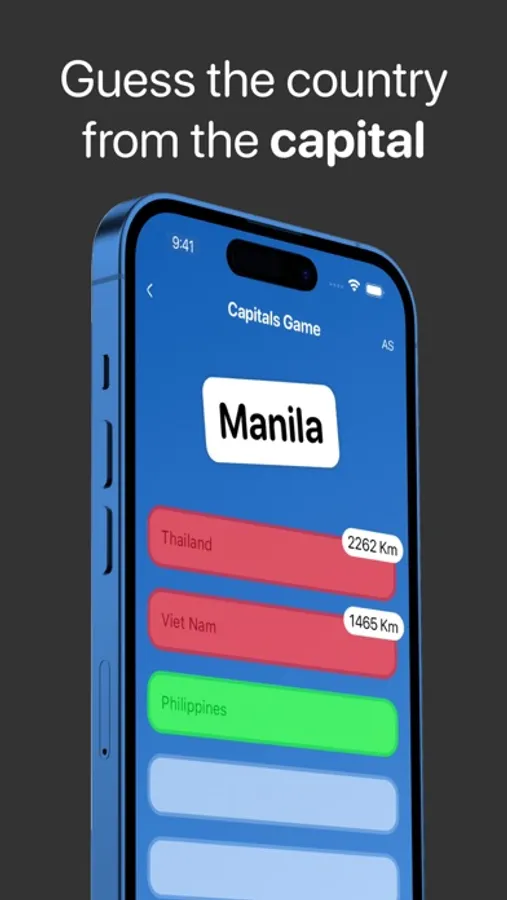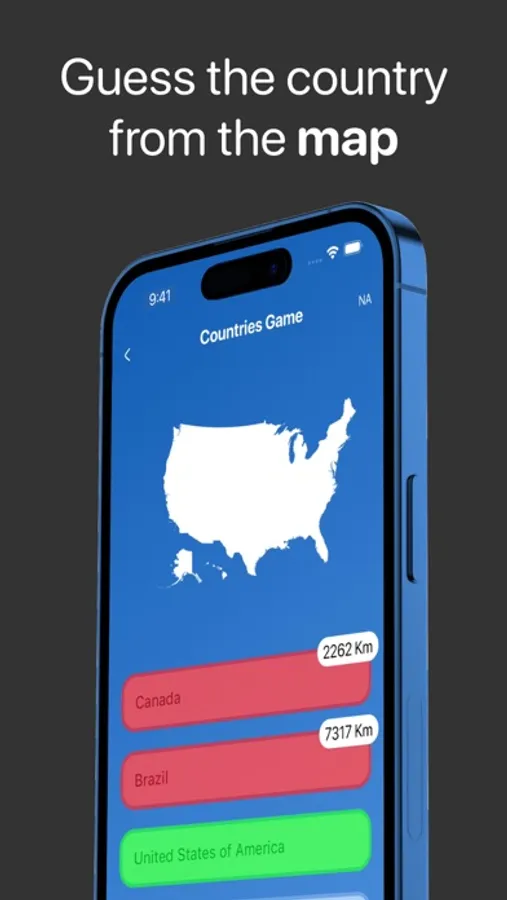 • If you answer incorrectly, the app will show you how far the written country is from the correct answer