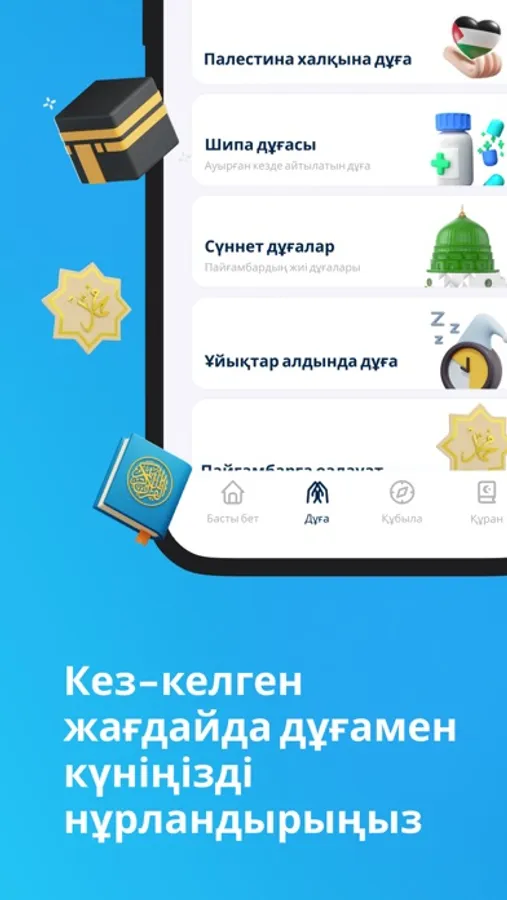 Read the Quran with translations in Kazakh, Russian, and English, or listen to its verses.