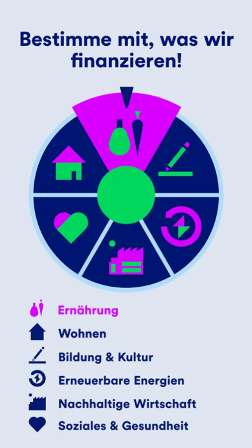 Bestimme mit Deinem individuellen Verwendungswunsch mit, was wir finanzieren sollen: Erneuerbare Energien, Ernährung, Wohnen, Bildung & Kultur, Soziales & Gesundheit oder nachhaltige Wirtschaft.