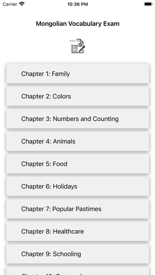 Expand your Mongolian vocabulary effortlessly with our comprehensive Mongolian Vocabulary Exam app! Whether you are aiming to enhance your language proficiency or you would like to test your knowledge, this app examines your vocabulary in 40 different topics.