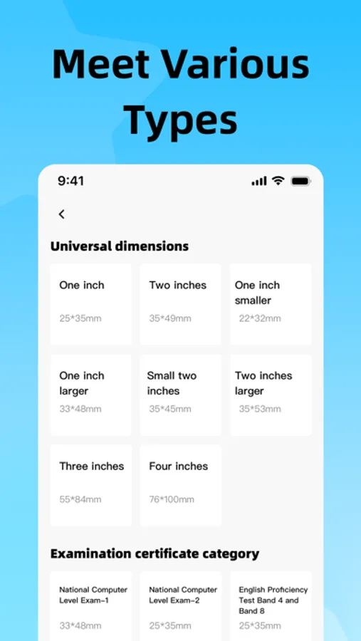 1. Multiple specifications: The application supports ID photo sizes from a variety of countries and regions. Whether you need a passport photo, ID card photo, or driver's license photo, it can be easily processed.