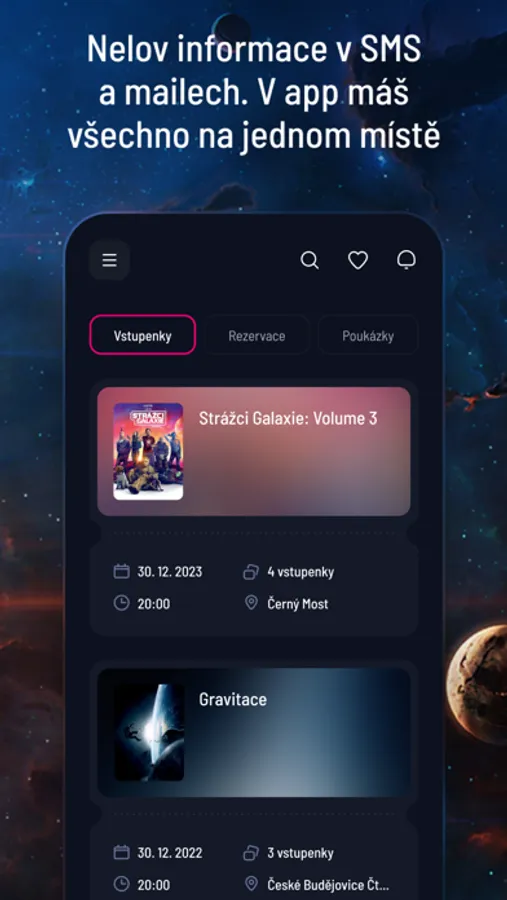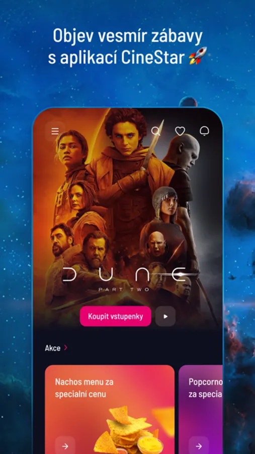Aplikace CineStar přináší revoluci v nakupování vstupenek do multikina. S touto aplikací můžete udělat nákup i rezervaci lístků třeba cestou v autobuse nebo ve frontě v supermarketu. Na jeden dotyk můžete pozvat své přátele, aby se přidali k vám, poslat jim vstupenku a mít vždy ty nejaktuálnější informace o nejnovějších filmových hitech. Stačí se jen dotknout.