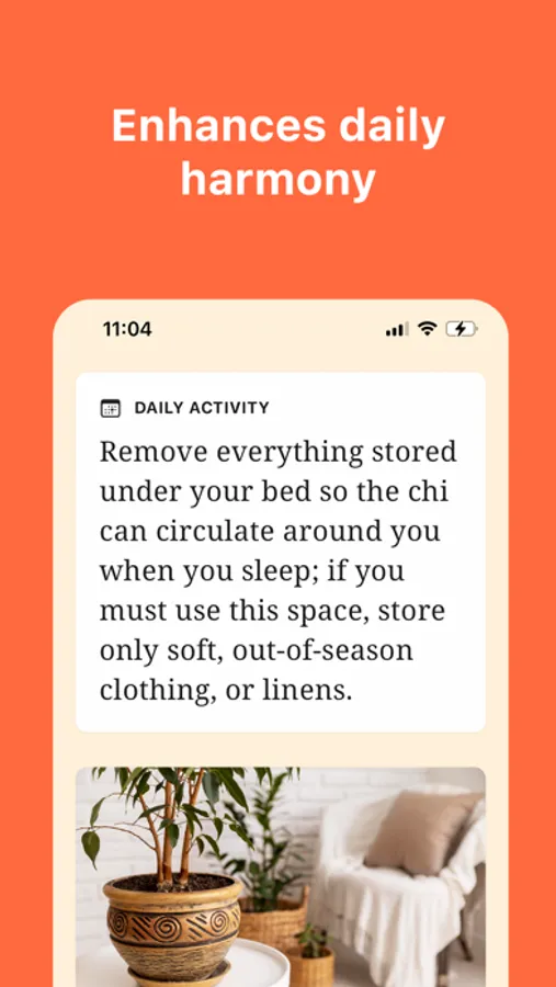Daily Feng Shui Tips: Receive personalized daily activities that promote chi flow and harmony. These simple yet effective tasks are tailored to your unique space and designed to be easily integrated into your daily routine.