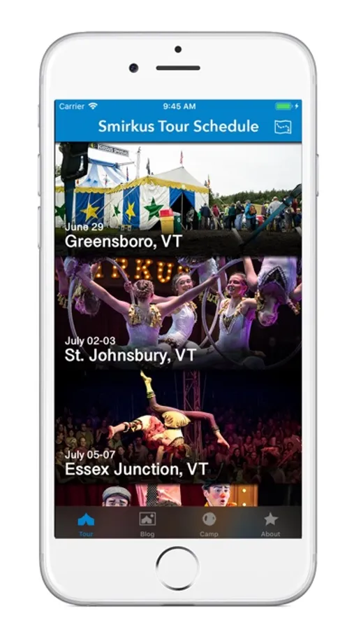 - Tour Schedule – Always know where the next Smirkus show will be! Get directions, buy your tickets (they sell out fast!) and add reminders to your calendar (show up early to pick your favorite seats!).