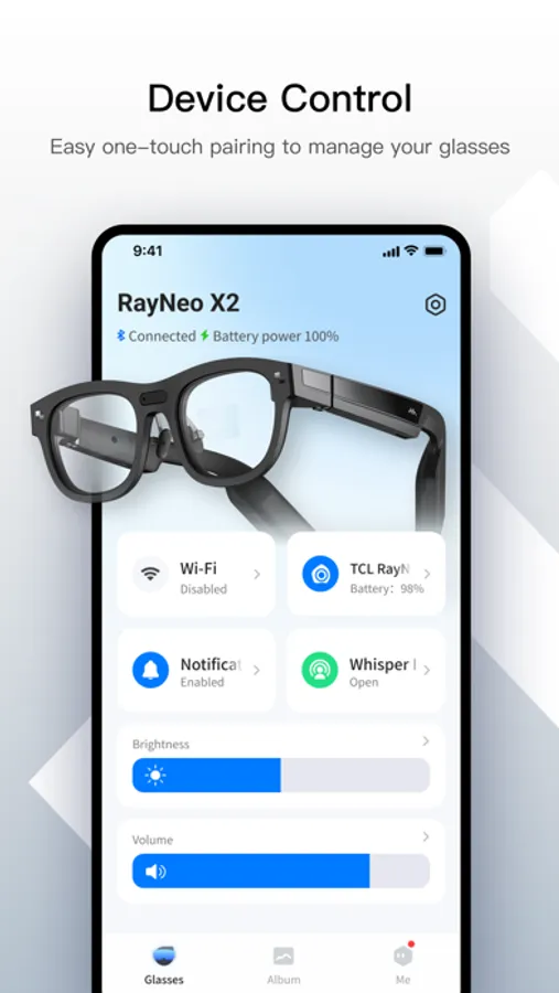 After the glasses are connected to your phone via Bluetooth, the data set on your phone is transmitted to the glasses. This implements accurate control for the glasses system. The data includes the brightness and sound settings on the phone