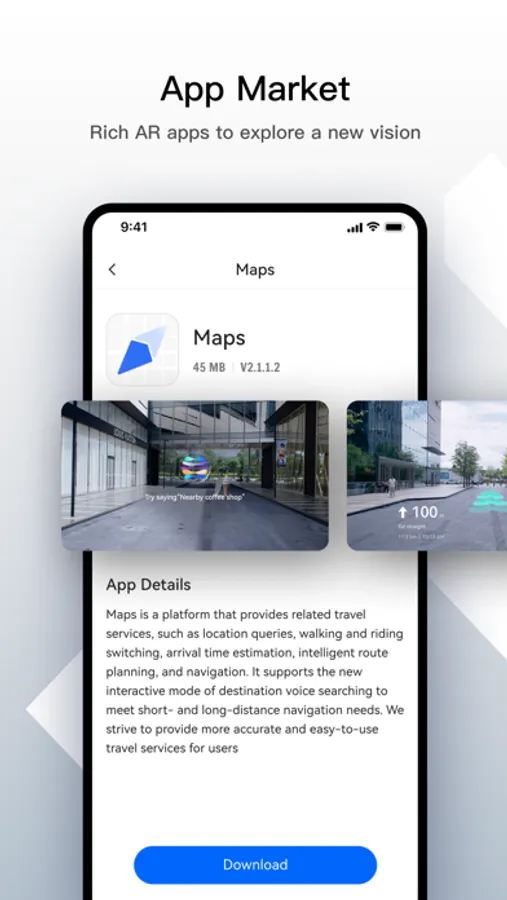 The product has an internal GPS positioning system that allows you to search for destinations, select navigation modes, and plan routes. The glasses push destinations and routes for AR navigation services