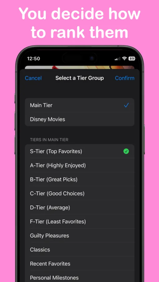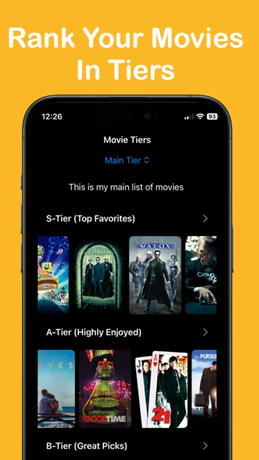 Automatic Genre Sorting: Add movies to your tiers and watch as they're automatically sorted into genres, making organization a breeze.