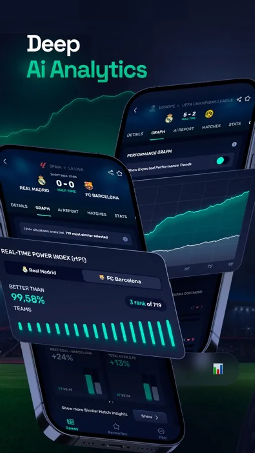 REAL-TIME POWER (rtP) - Shows team strength based on comprehensive statistics, with average and dynamic (10-minute changes) views. Calculates live soccer score from 1 to 100 that reflects the gameplay quality.
