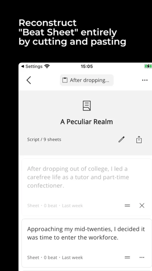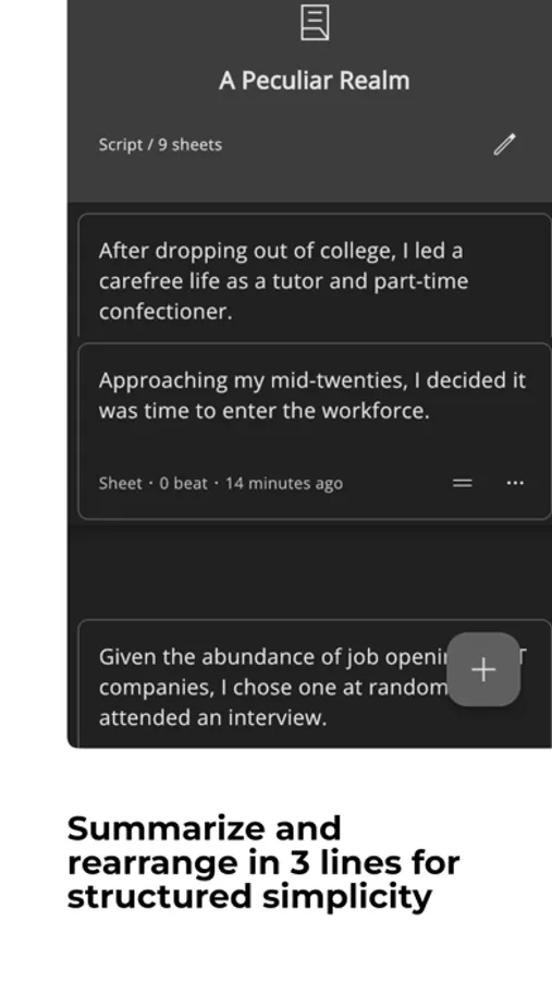 With "Beat Sheet 3", you can succinctly capture the essence of each box's content in 3 lines and freely rearrange them through a drag-and-drop interface. Adhering to the three-line format helps clarify key points and facilitates easy checks for story balance, consistency, and completeness. This versatile app is not limited to storytelling; it can also be a valuable partner in your business ventures.
