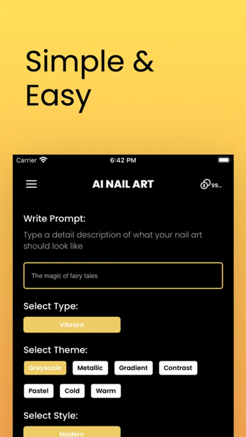 Color Themes: Customize the color nails to match your preferences. Experiment with different themes like “Greyscale,” “Metallic,” “Gradient,”, “Contrast”, “Pastel”, “Cold” and “Warm”, and find the perfect fit for your style.