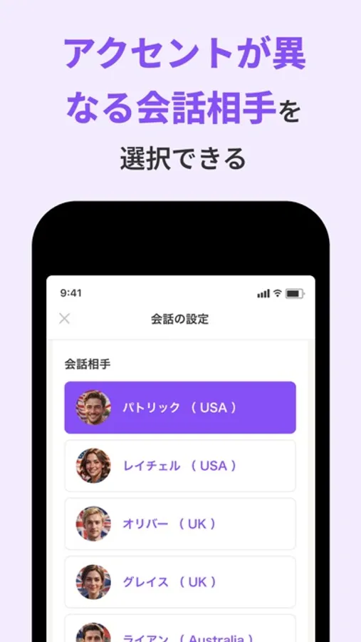 アメリカ、イギリス、オーストラリア、インドからアクセントを選ぶことが可能です。取引先の方や同僚の国籍などに合わせ、あなたにとって最適なAIコーチを選びましょう。