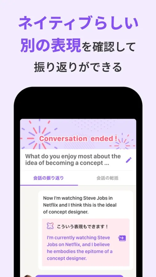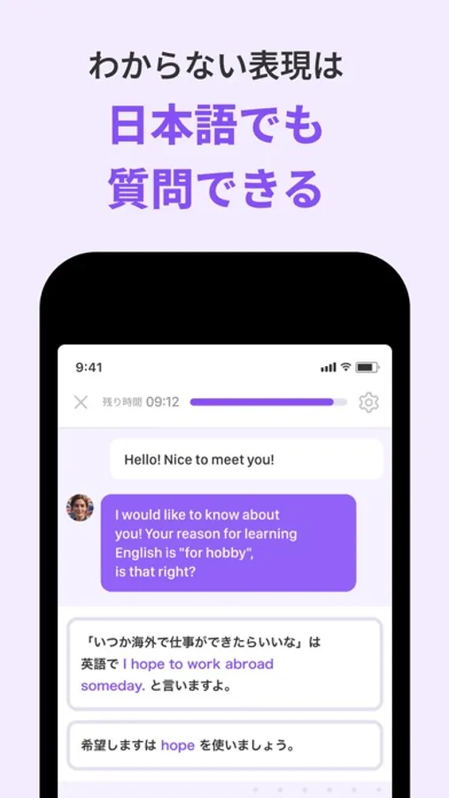 AI英会話コーチと話している中で伝えたい英語が出てこないときには日本語で質問すると英語での表現を教えてくれます。日常英会話の表現はもちろん、ビジネスで使うような難しい表現も、わからないことは全て教えてくれます。
