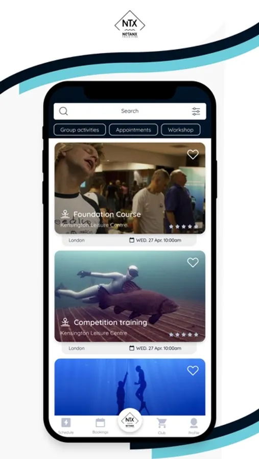 - Users can book on to NTX Freediving training courses, workshops and competitions