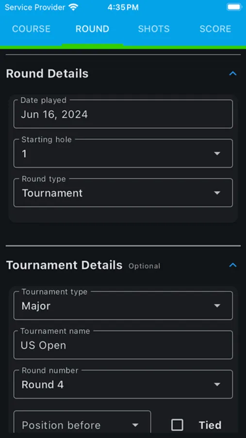 * Detailed Round Info: Record all essential round details, and optionally include Round Notes, Swing Thoughts, Course Conditions, and Weather Conditions.