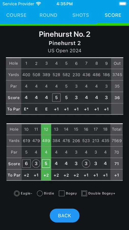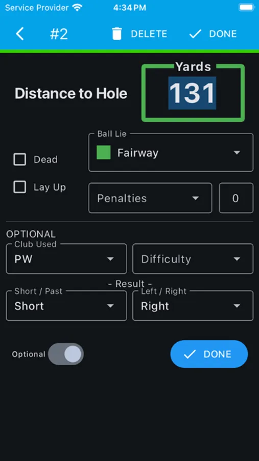 * Detailed Shot Info: Optionally record detailed information about each shot, including Distance to Hole, Club Used, Penalties, Dead, Lay Up, Difficulty, Finish Position, Putt Break, and Putt Slope.