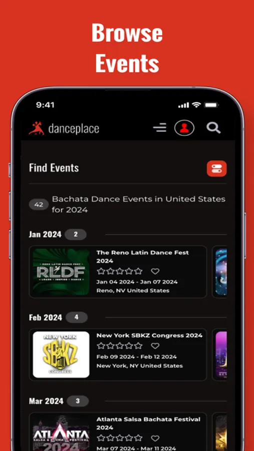 Explore your favourite dance events with the free Danceplace event app. Stay informed with real-time updates and announcements. See venues, artists and workshop schedules effortlessly. Create a personalized event agenda. Rate events, workshops and activities. Dance event organizers can stay connected with customers and hear their feedback. Give customers a reliable tool to find event information and plan their time effectively – right from their smartphone.