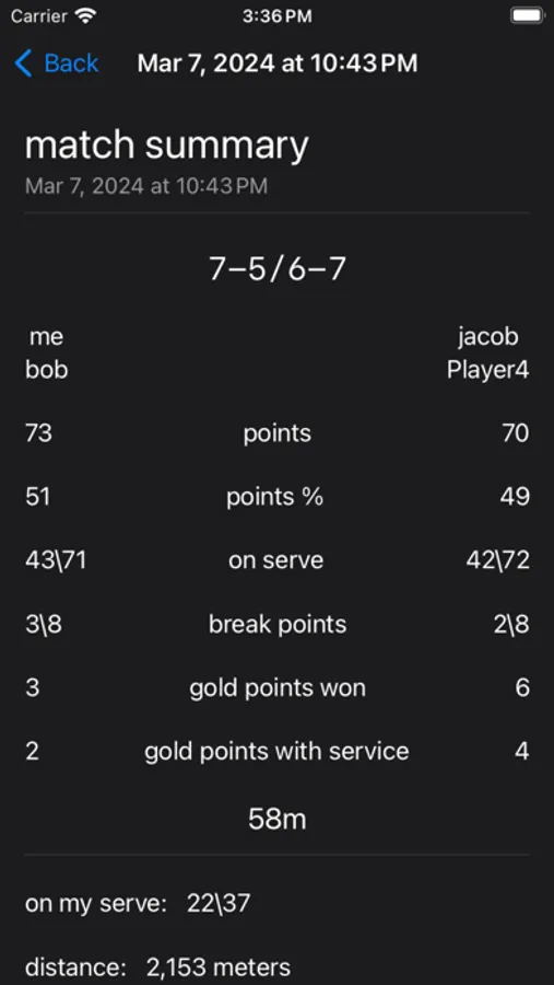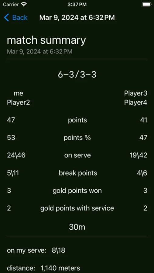 PLAYER STATISTICS: Dive into your performance details, tracking serve success rate, break and golden points, and distance travelled during a match among other stats.