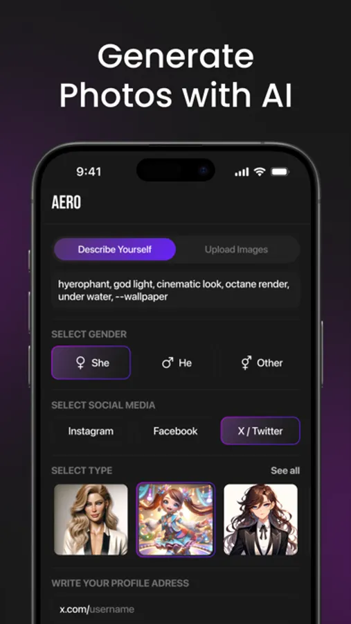 Simply upload your image, select your gender, choose your preferred social media platform, and define your style. With just a few clicks, AERO AI generates tailored avatars and profile pictures that reflect your personality and vision.