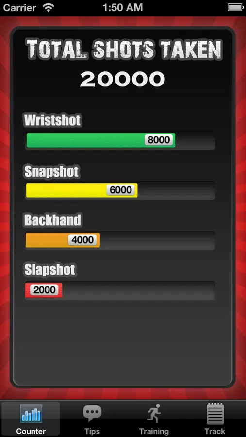 to reach 10 000 shots. The shot counting screen can be used to keep track of slapshots, wrist shots, back hands, and snap shots.