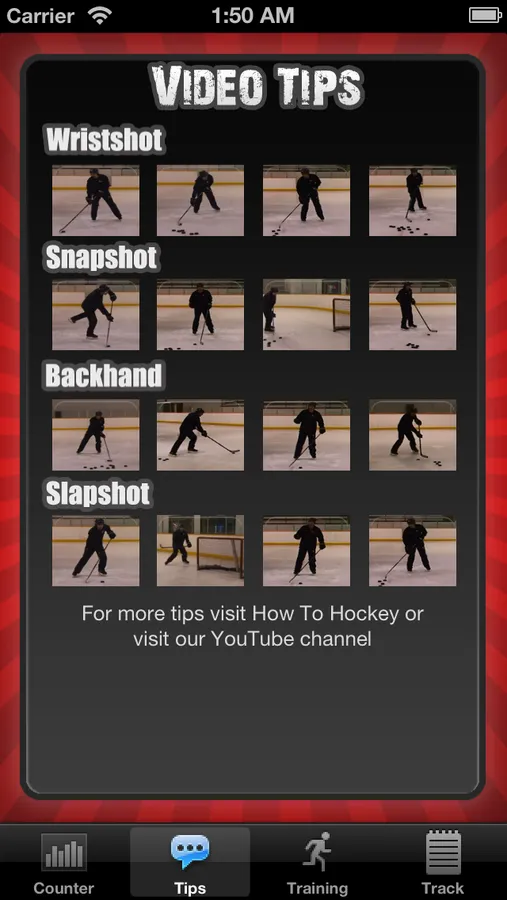 The iSnipe app is a training tool that will help hockey players improve their shot. The player will benefit from video teaching tips, a shot counter, two training tools, and a tracking page
