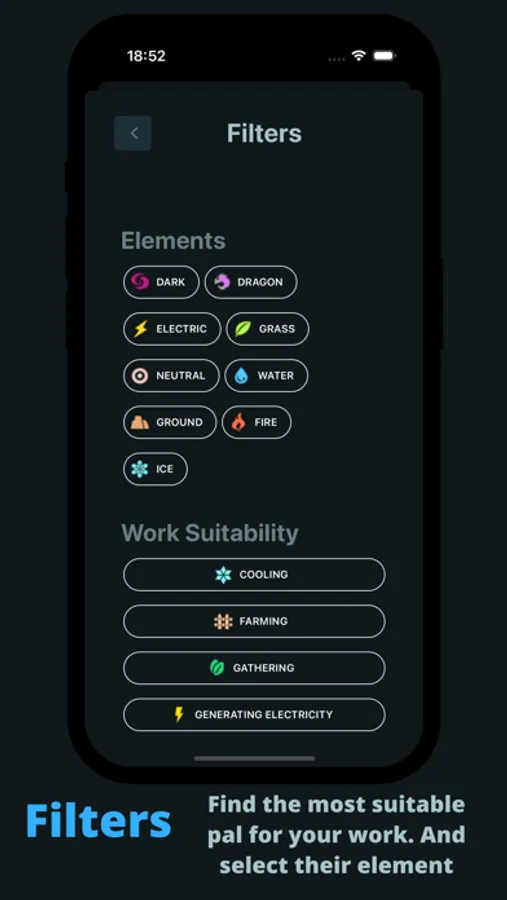 Keep track of which pals you've received the bonus reward, breeding tree, filter them based on Element, Work Suitability and more.
