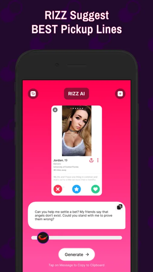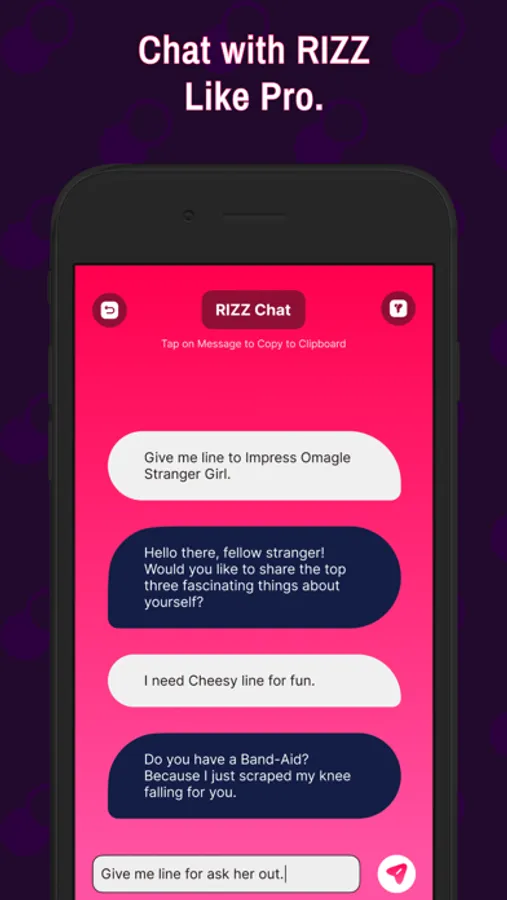 Unique pickup Lines: Break the ice seamlessly with pickup lines that are context-aware. Whether you're starting a conversation on a dating app, meeting someone in person, or even planning a virtual date, Rizz ai tailors its suggestions to suit the setting.