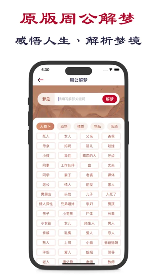 【分类检索功能】 我们将梦境细分为多种类别,包括人物、动物、植物、物品、活动、生活、自然、鬼神、建筑等,为用户提供有针对性的解梦服务,更快捷地找到特定梦境的解释。