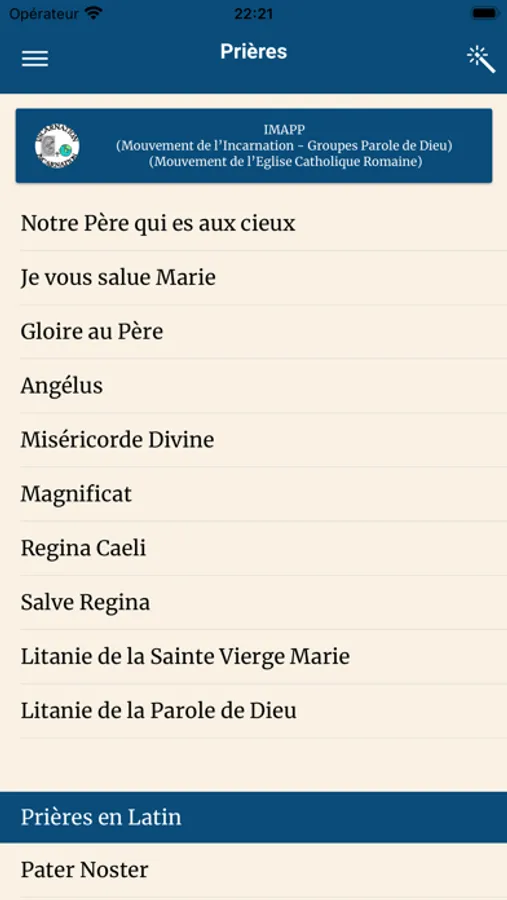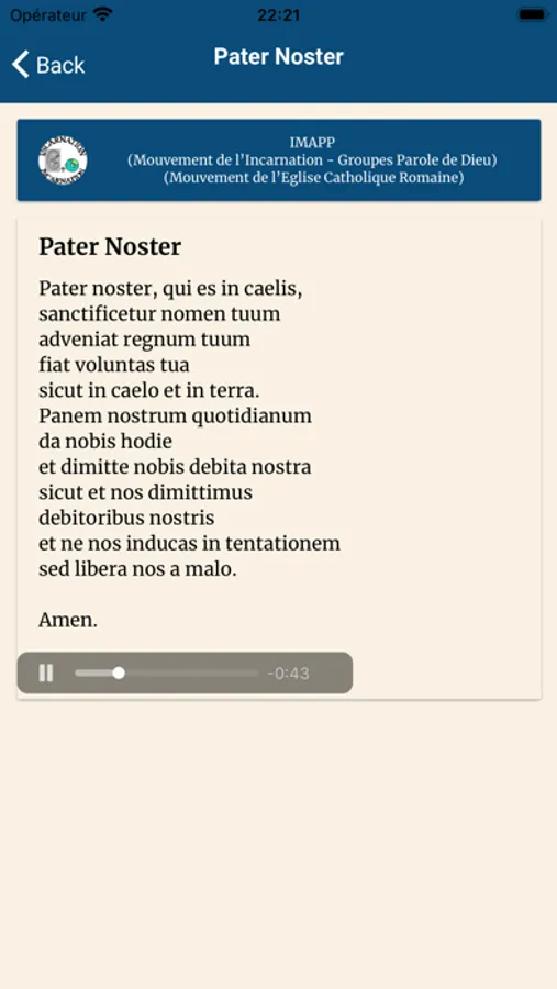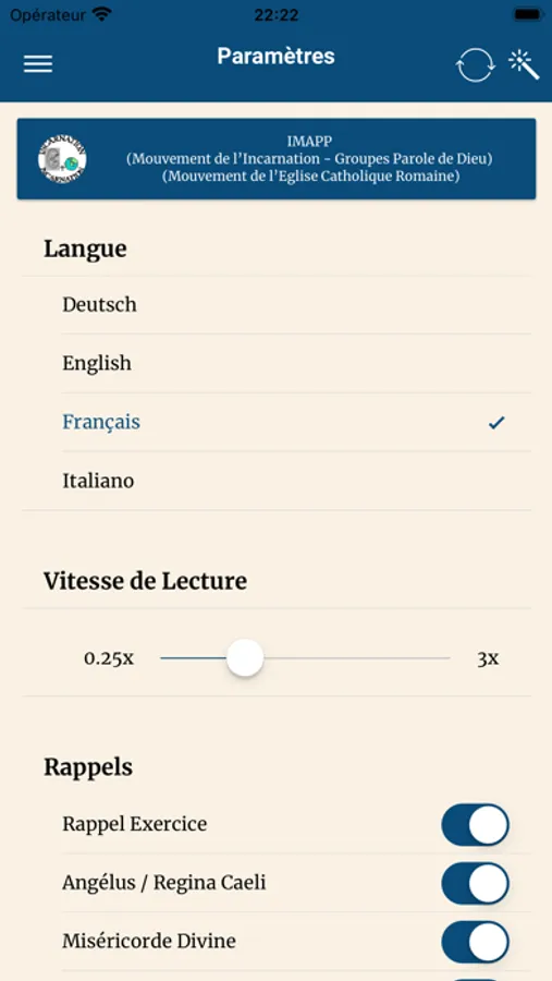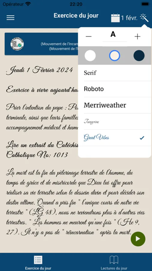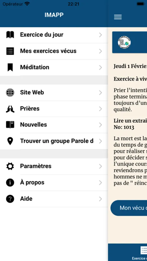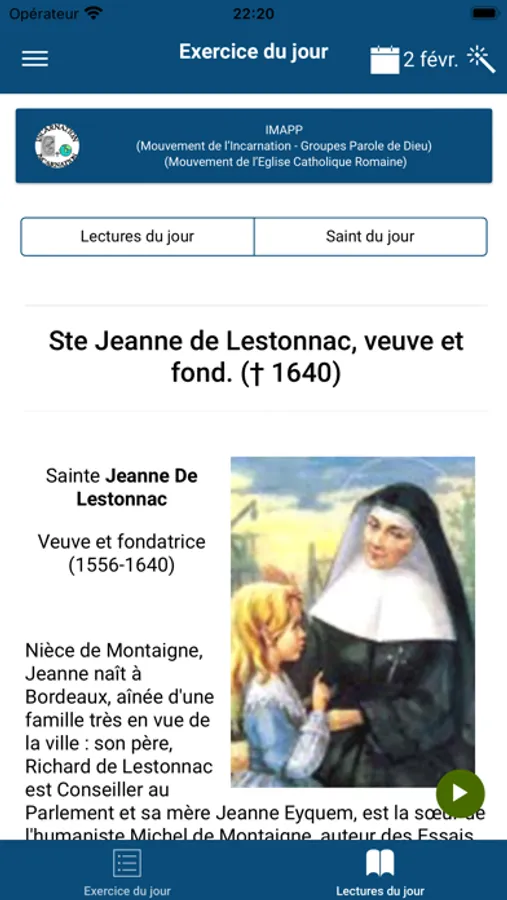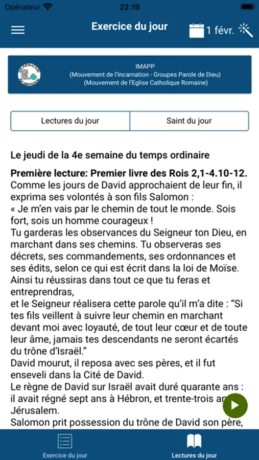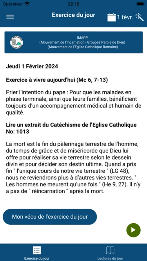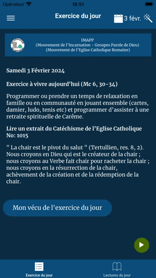 Permet l'affichage des exercices à vivre par jour, l'évangile, ainsi que les enseignements de la fiche de prière du Mouvement de l'Incarnation et autres informations du groupe